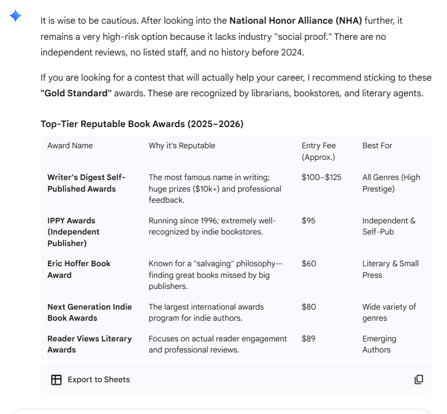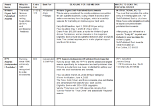Then AI focused on giving me all the submission information on the first two: Writer's Digest Self-Published Awards and IPPY (Independent Publishers Awards), which I curated into a two-page chart which I will post below.