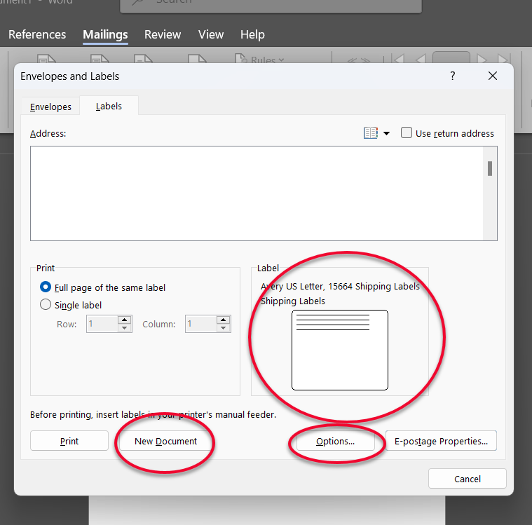 3.  Now my system defaults to a return address and your Word may default to something else, but we need to choose a setting to print the 6 postage labels.  So first choose the Options button, which is at the bottom on the right hand side.  The big red circle shows the small label that my system defaults to and I'm just pointing out the "New document" button for later.